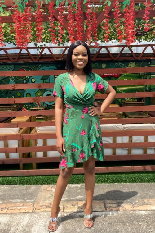 GREEN FLORAL FAUX WRAP DRESS