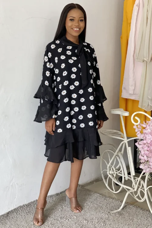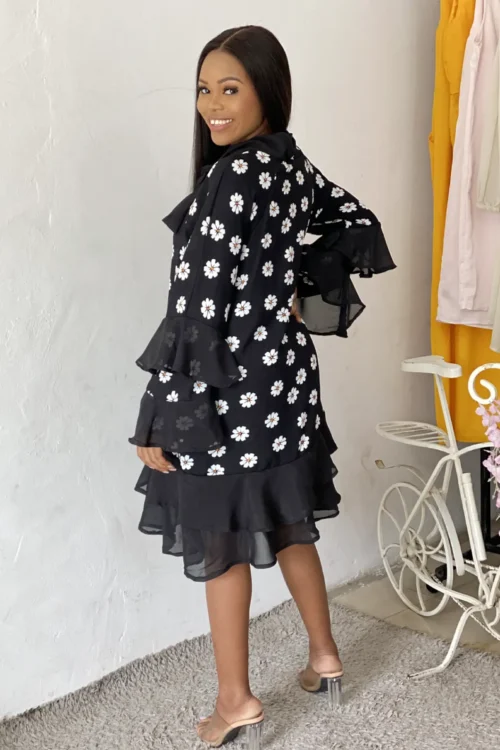 BLACK DAISY PRINT RUFFLE SHIFT DRESS